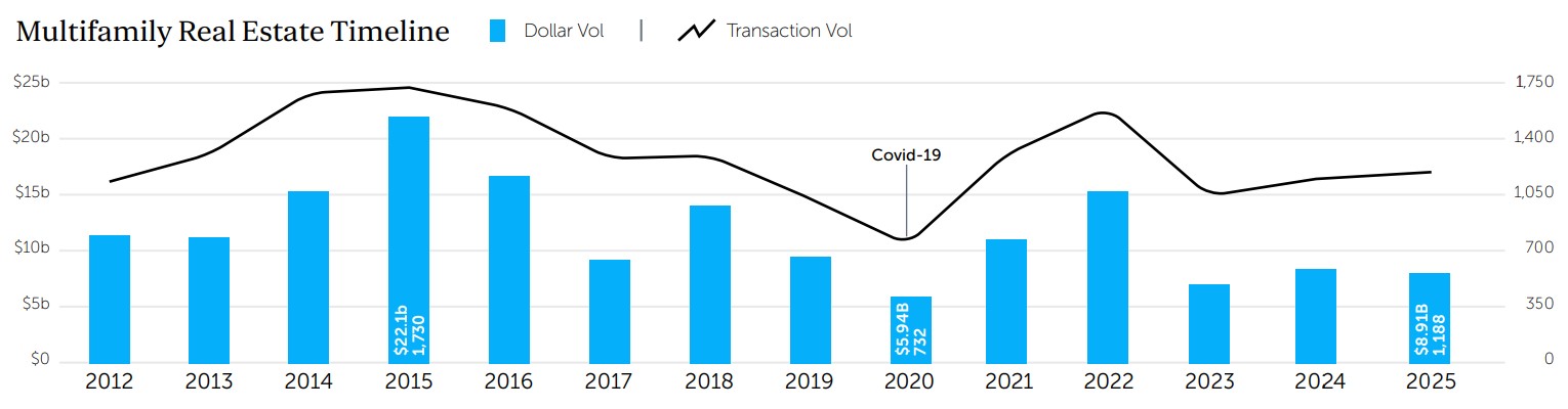 NEW YORK, NY – January 16, 2026 – New York City’s multifamily market in 2025 saw transaction volume climb 4% year-over-year to 1,188 trades and total dollar volume ease slightly to $8.91 billion, down from the $9.1 billion in 2024, according to Ariel Property Advisors’ Multifamily Year In Review New York City 2025.